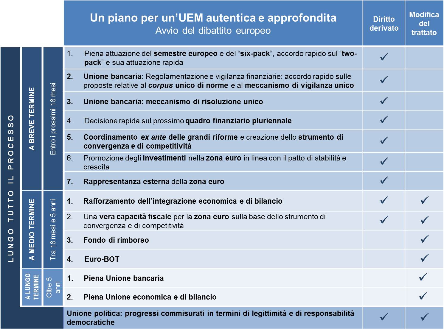 La relazione avanza una serie di proposte concrete per costruire, nel corso di un decennio, quattro nuovi pilastri fondanti di una più solida architettura dell’Unione europea, che preveda, a completamento dell’unione monetaria, un’unione bancaria, un’unione economica, un’unione fiscale, in un quadro di rafforzamento della legittimità democratica e della responsabilità, quindi, attraverso un’unione politica.
