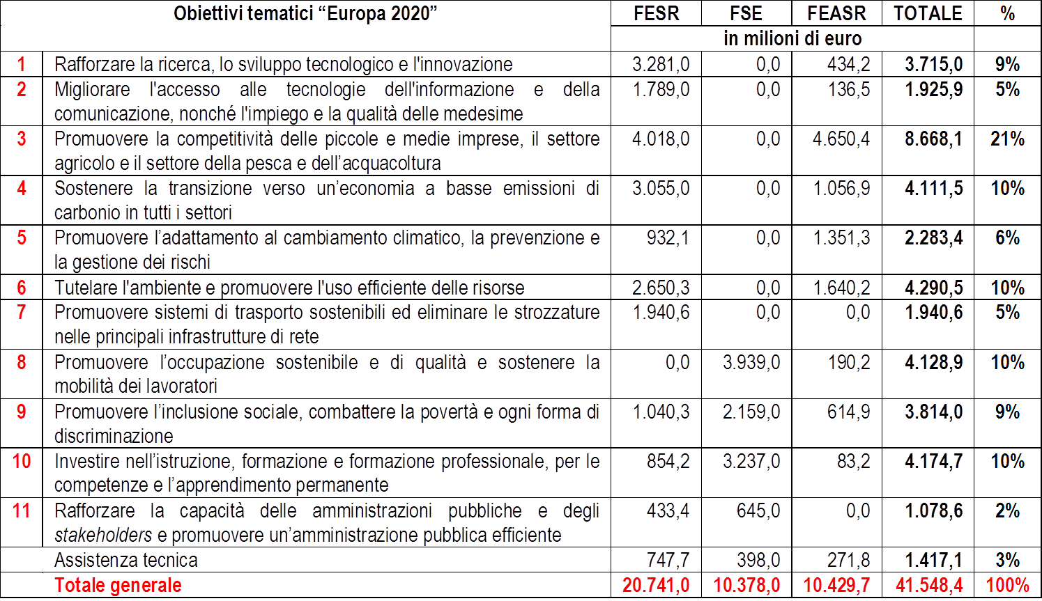 Nella tabella seguente sono sintetizzate le priorità di spesa che il Governo e le regioni italiane hanno proposto e presentato il 22 aprile scorso alla Commissione europea.
