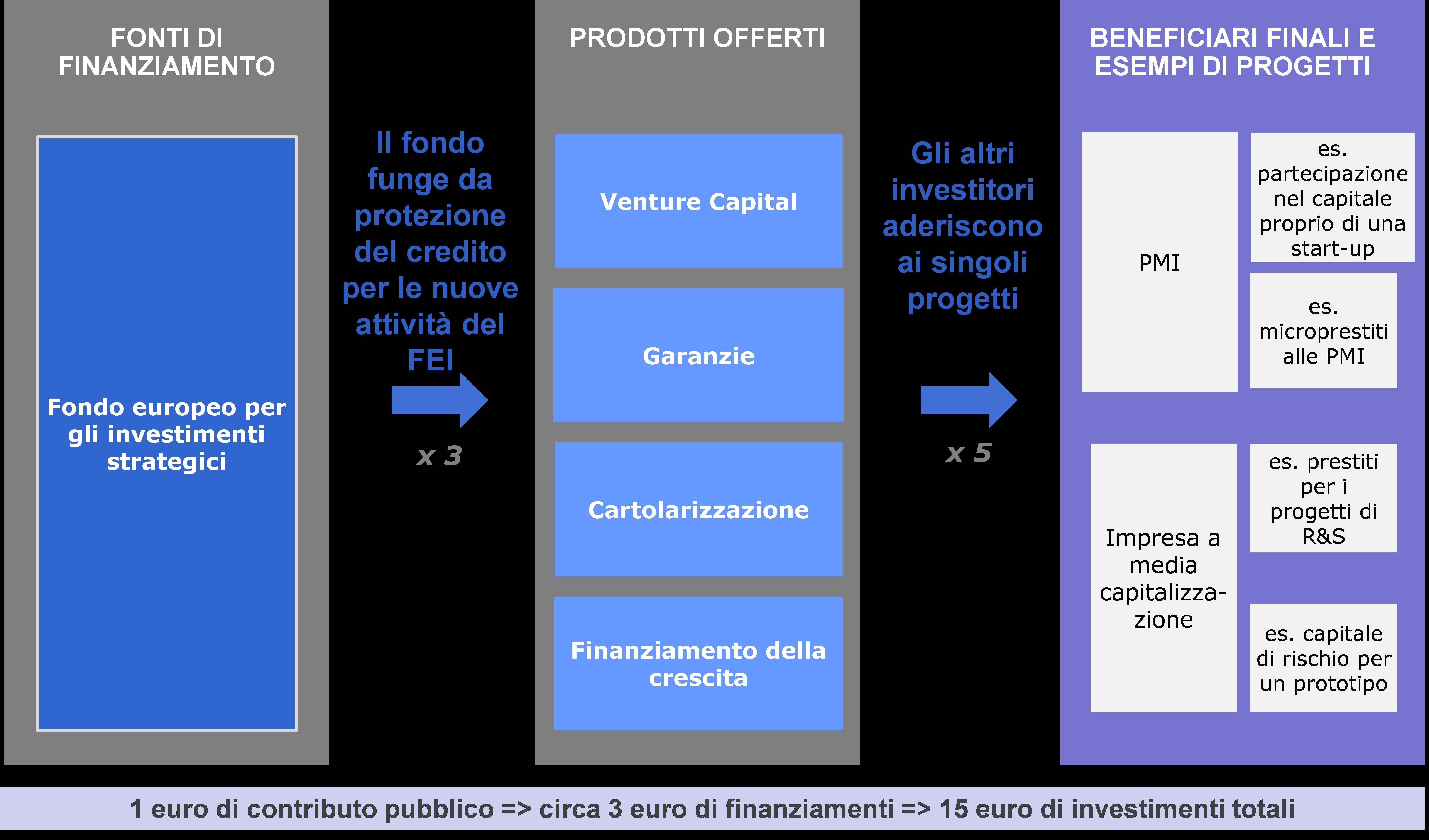 Il Fondo europeo per gli investimenti strategici finanzierà non solo i singoli progetti, ma potrà anche sostenere strutture di fondi privati, quali i citati fondi di investimento europei a lungo termine (ELTIF), create da investitori privati e/o da banche di promozione nazionali.