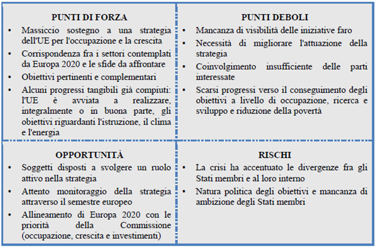Basandosi sui contributi ricevuti, la Commissione ha quindi individuato una serie di punti di forza, punti deboli, opportunità e rischi per la strategia Europa 2020.
