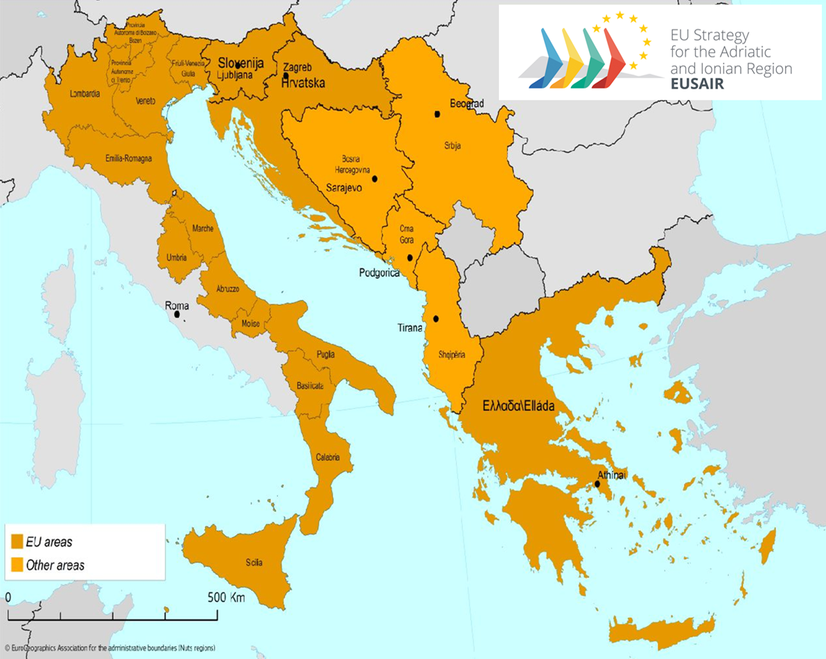 E’ la prima strategia macro-regionale dell’Unione che coinvolge una percentuale così elevata di paesi extra-UE (Albania, Bosnia-Erzegovina, Montenegro e Serbia), chiamati a cooperare con i paesi membri dell’UE (Croazia, Grecia, Italia e Slovenia). In Italia, sono dodici le regioni e due provincie autonome italiane interessate dalla strategia, come evidenzia la seguente mappa.
