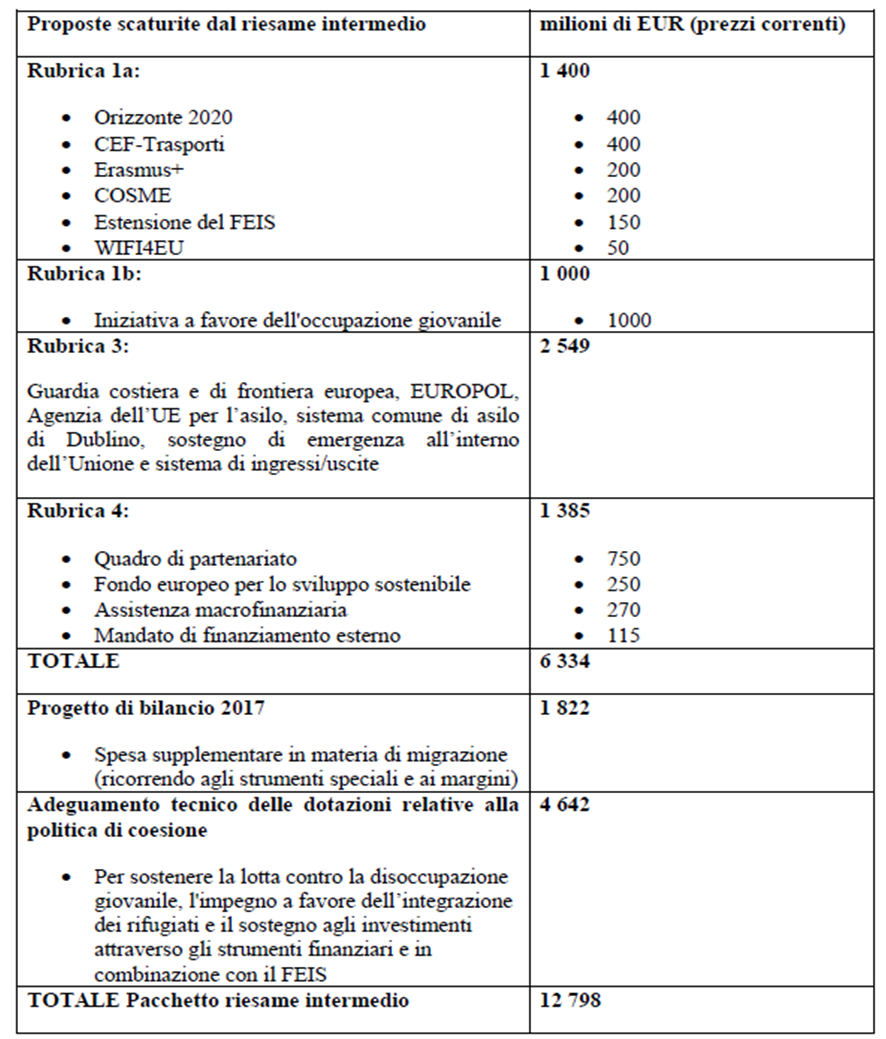 - Comunicazione della Commissione, Riesame/revisione intermedia del quadro finanziario pluriennale 2014-2020 Un bilancio dell’UE incentrato sui risultati, doc. COM(2016) 603 del 14.09.2016