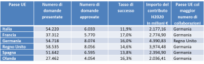 La situazione relativa all’Italia è sintetizzata nella seguente tavola: 54.220 le domande di contributo presentate da imprese, organismi di ricerca e ricercatori italiani; 6.033 le domande approvate, una ogni nove domande, con un tasso di successo dell’11,9%.