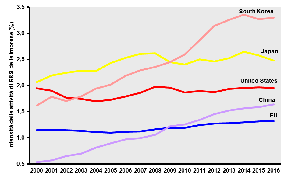 La modesta entità degli investimenti privati destinati all’innovazione è una persistente debolezza dell’Europa. Il livello di investimenti nella ricerca e innovazione da parte delle industrie nell’Unione europea è pari all’1,3% del prodotto interno lordo.