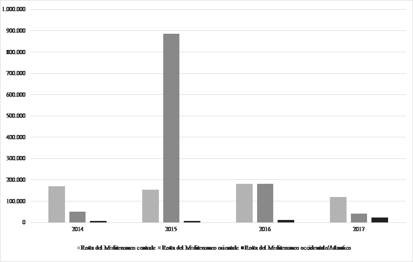 Il seguente grafico illustra l’andamento dei flussi migratori irregolari, registrato negli ultimi tre anni attraverso le principali tre rotte verso l’Europa: il Mediterraneo centrale, orientale e occidentale.
