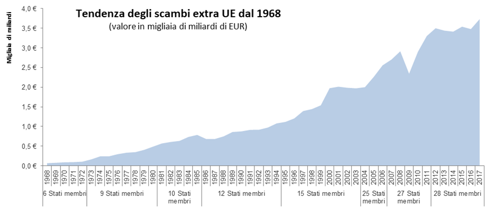 - proseguimento del lavoro sulle relazioni internazionali. Nel 2017 le importazioni da paesi terzi verso l’Unione hanno raggiunto un totale di 1.879 miliardi di euro e le esportazioni dall’Unione verso paesi terzi sono arrivate a 1.859 miliardi di euro . Il volume di questi scambi esterni è costantemente in crescita; ciò comporta una maggiore e continua cooperazione tra l’Unione e i paesi terzi, sia per migliorare la conformità alla normativa doganale sia per agevolare nel contempo gli scambi dell’Unione europea con il mondo esterno.