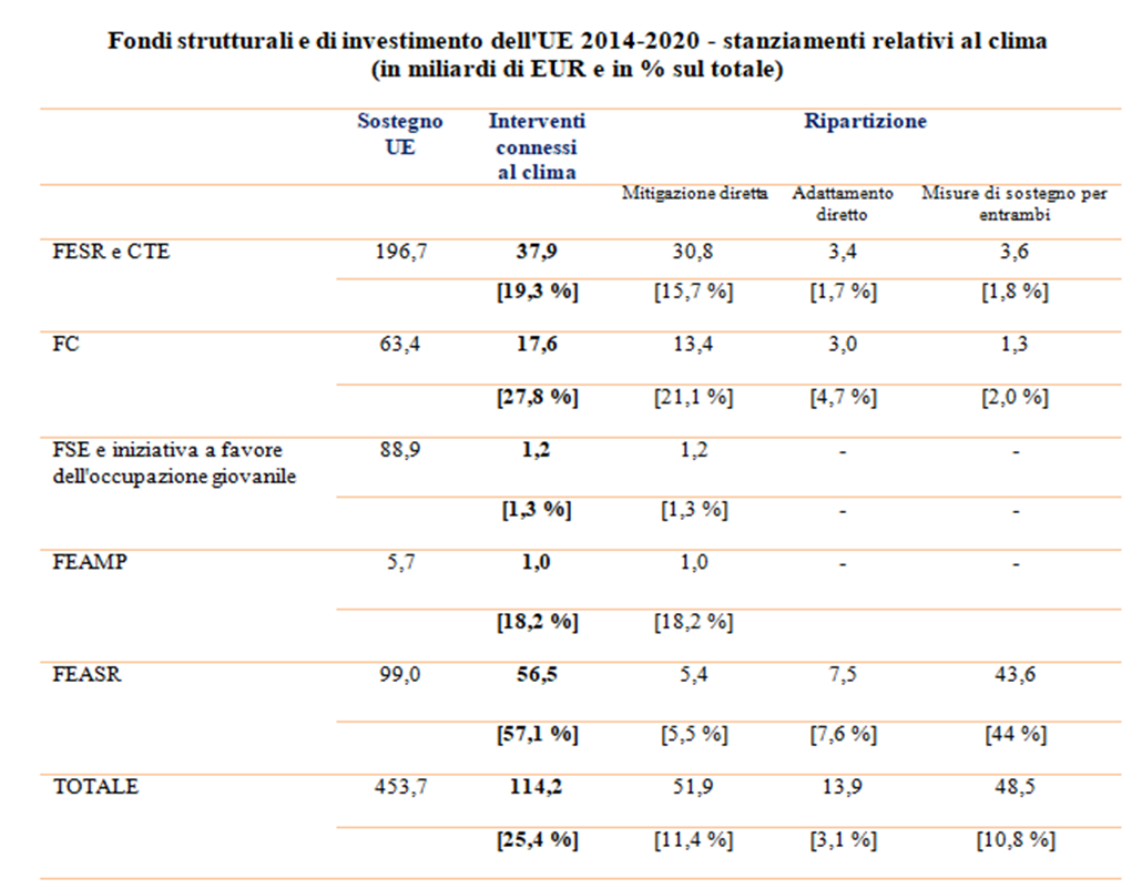 Infine, la seguente tabella evidenzia gli stanziamenti dell’Unione europea a favore dell’adattamento ai cambiamenti climatici nell’ambito dei vari programmi di finanziamento: nell’attuale ciclo di programmazione 2014-2020 ammontano a circa 115 miliardi di euro, il 25% delle risorse di cui dispone l’Unione.