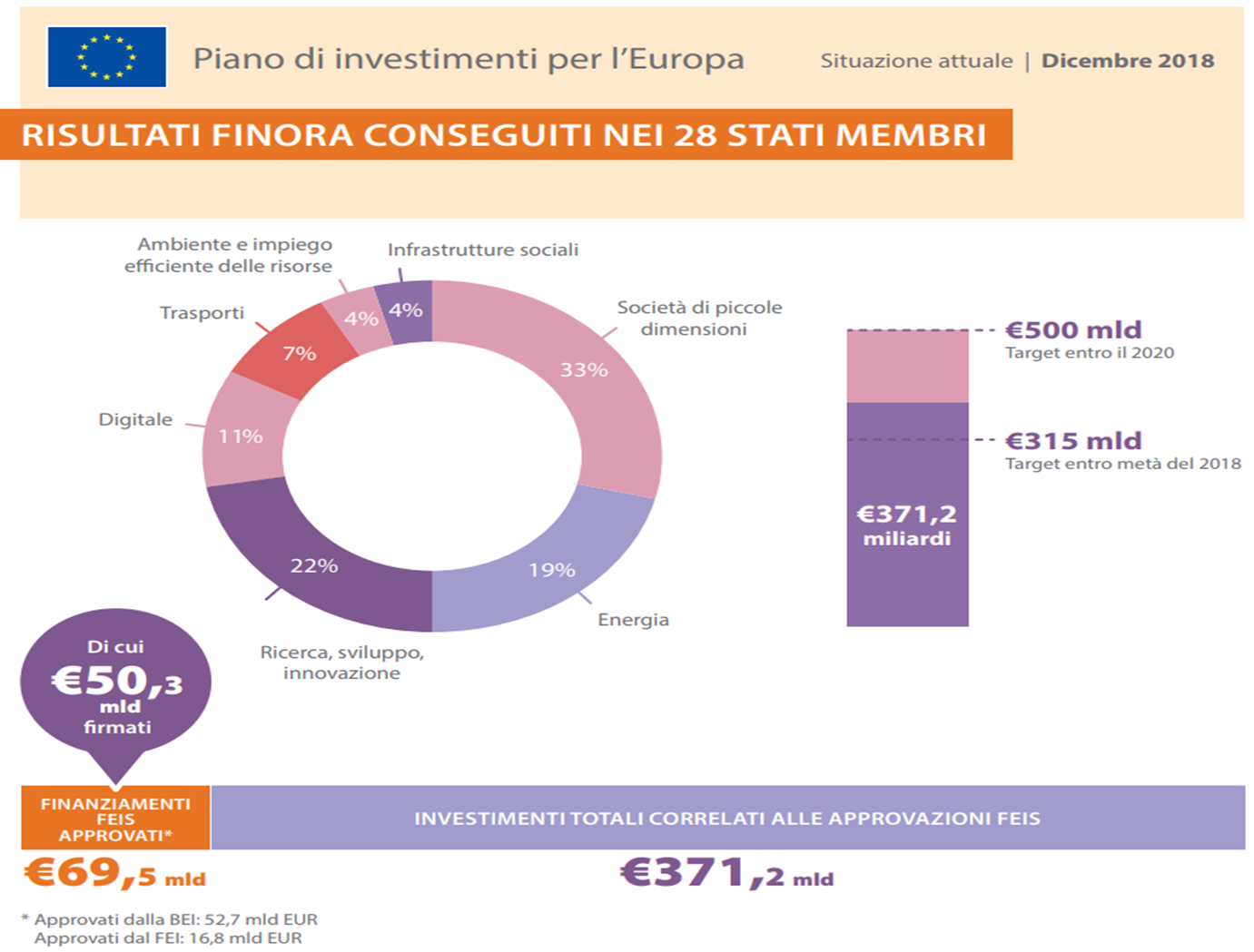 Secondo i dati forniti dalla Commissione europea, il totale dei finanziamenti erogati all’Italia dal FEIS alla fine del 2018 è pari a 9,4 miliardi di euro, che dovrebbero mobilitarne altri 55 di investimenti aggiuntivi.