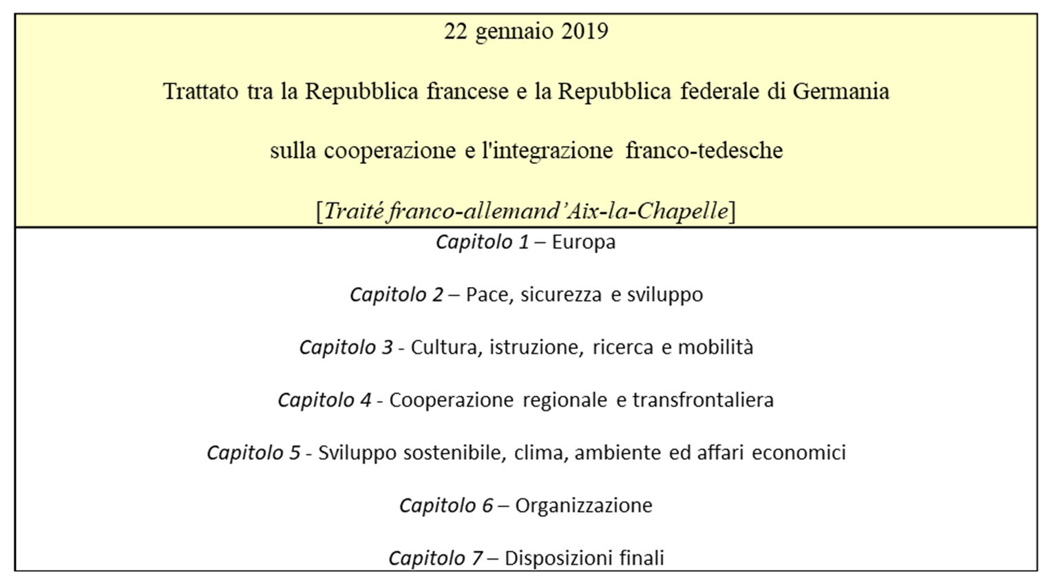 Il Traité entre la République française et la République fédérale d’Allemagne sur la coopération et l’intégration franco-allemandes non sostituisce ma integra il precedente Trattato dell’Eliseo sulla cooperazione franco-tedesca del 22 gennaio 1963, e si compone di un preambolo e di 28 articoli, suddivisi in 7 capitoli, come indicato nella seguente tavola.