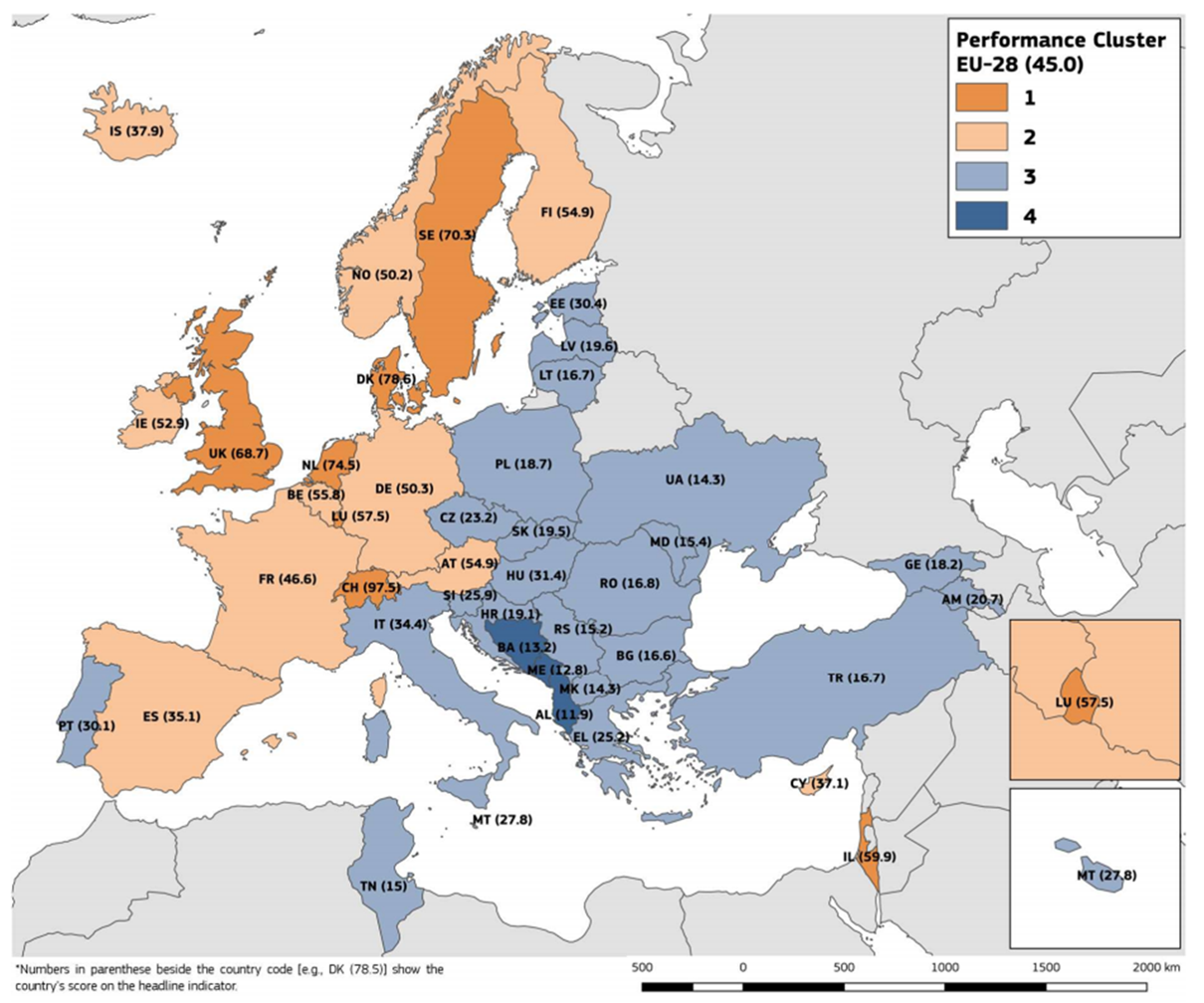 Per fare un esempio, il primo indicatore, quello che misura l’eccellenza dei sistemi nazionali della ricerca – e che copre quattro dimensioni (investimenti pubblici in ricerca e sviluppo; partecipazione alle borse Marie Skłodowska-Curie per lo scambio di ricercatori; domande di brevetto rispetto alla popolazione; infine, le 10 pubblicazioni più citate) – fornisce la seguente mappa della situazione dei singoli Paesi europe, dove i Cluster 1 e 2 rappresentano gli Stati con le migliori performance, mentre i Cluster 3 e 4 rappresentano i Paesi con le più basse performance a livello europeo.