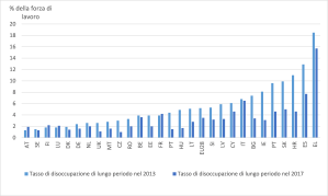 L’impatto di tali miglioramenti si è visto anche nel tasso medio di disoccupazione di lungo periodo nell’intera Unione europea, il quale ha continuato a diminuire, passando dal 5,2% nel 2013 al 3,5% nel 2017: il grafico descrive la situazione in ciascuno Stato membro dell’Unione.