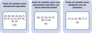 Anche in questo caso, tuttavia, il grado di attuazione è diverso: alcuni Stati membri hanno introdotto elementi fondamentali (per esempio i meccanismi di condivisione dei dati), mentre altri hanno designato un’autorità come punto di contatto unico, senza però garantirne l’operatività.