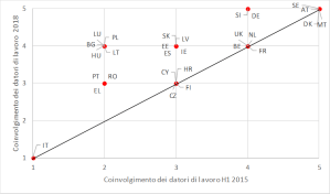 Infine, dalla adozione della raccomandazione, 14 Stati membri hanno migliorato la qualità delle misure per aumentare il coinvolgimento dei datori di lavoro, come indica il seguente grafico, dal quale si può notare che, in Italia, il “sistema” di raccordo tra servizi sociali e per l’impiego e datori di lavoro non esiste.