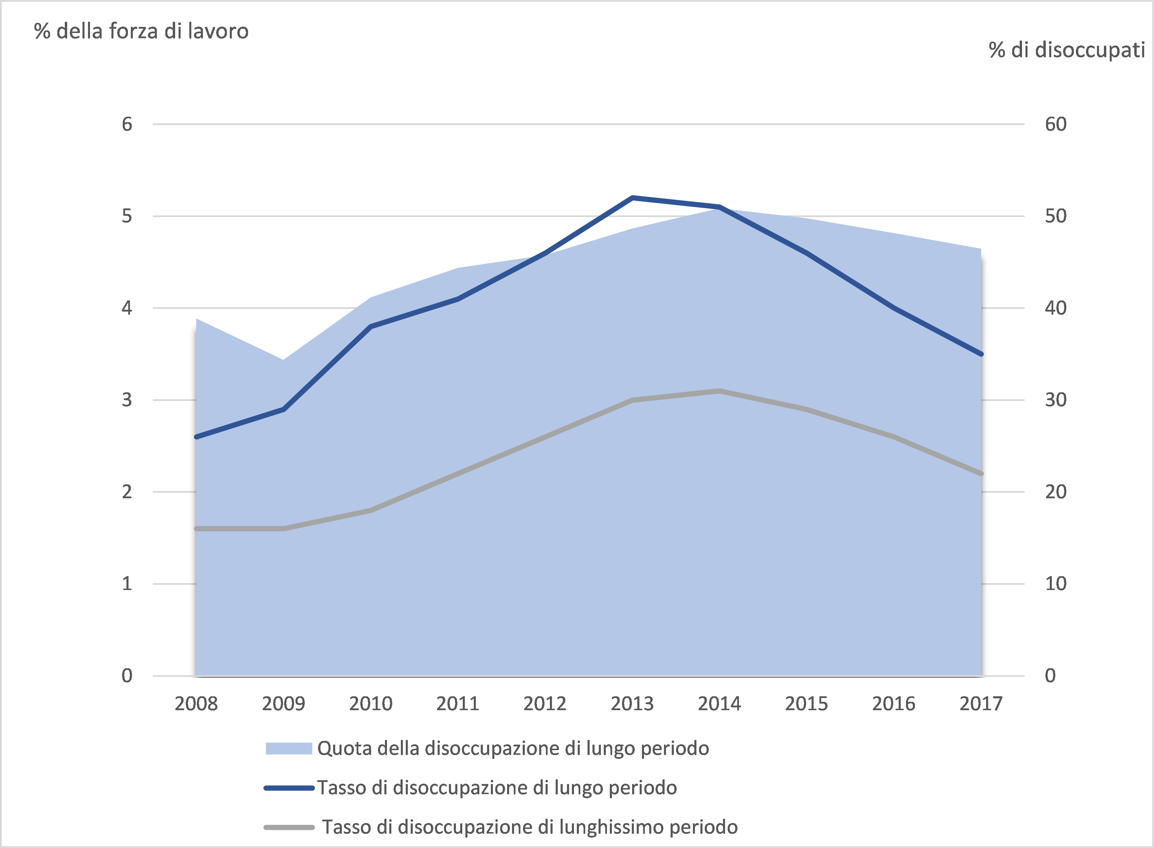 In Europa, nel periodo della crisi, tra il 2007 e il 2013, il numero di persone disoccupate da oltre un anno, cioè i cosiddetti “disoccupati di lunga durata”, è raddoppiato. La punta massima della disoccupazione di lungo periodo ha colpito circa 12 milioni di persone.