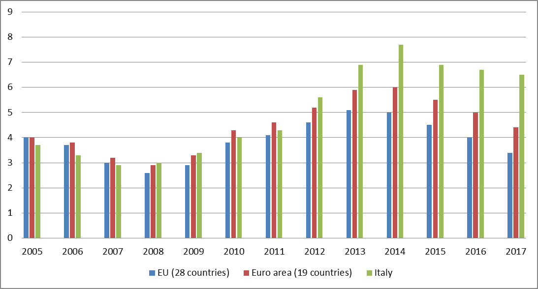 Tuttavia, la situazione della disoccupazione di lungo periodo è ancora grave e, soprattutto, interessa alcuni Paesi dell’Unione europea, tra i quali l’Italia, la quale, come si scriverà tra poco, ha una media più che doppia rispetto alla media dei 28 Paesi dell’Unione europea.