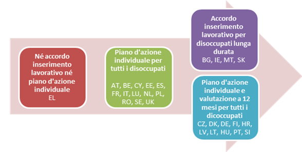 I dati di monitoraggio indicano che la maggior parte dei servizi pubblici per l’impiego fornisce un piano d’azione individuale a tutti i disoccupati registrati poco dopo la registrazione e spesso al più tardi entro 6 mesi. Il piano d’azione individuale, proposto dopo la valutazione iniziale, definisce l’offerta di servizi e i diritti e gli obblighi del prestatore di servizi e dell’assistito; pertanto costituisce la base dell’accordo di inserimento lavorativo di cui alla raccomandazione.