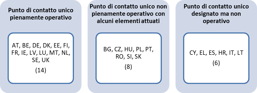 La seguente figura illustra la situazione nei singoli Stati membri: l’Italia ha designato lo sportello unico sulla carta, ma non risulta operativo.