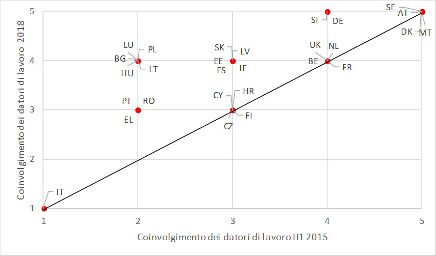 Infine, dalla adozione della raccomandazione, 14 Stati membri hanno migliorato la qualità delle misure per aumentare il coinvolgimento dei datori di lavoro, come indica il seguente grafico, dal quale si può notare che, in Italia, il “sistema” di raccordo tra servizi sociali e per l’impiego e datori di lavoro non esiste.