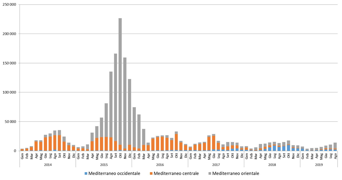 Oggi la situazione è tornata ai livelli precedenti la crisi, con arrivi, nel settembre 2019, inferiori del 90% circa a quelli del settembre 2015. La situazione resta tuttavia instabile. Infatti, nei primi otto mesi del 2019 alle frontiere esterne dell’Unione sono stati rilevati circa 70.800 attraversamenti irregolari. Inoltre, al 7 ottobre 2019 il numero di migranti dichiarati morti o dispersi nel tentativo di attraversare il Mediterraneo era di quasi 1.100 persone.