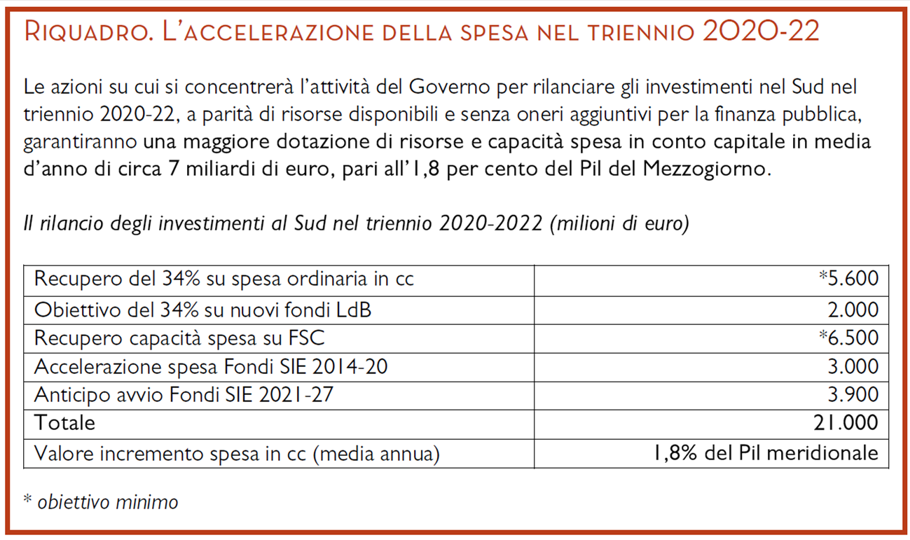 Sono già disponibili, in cassa, 21 miliardi di euro per investimenti nelle otto Regioni del Sud nel triennio 2021-2022: si tratta di risorse già destinate al Mezzogiorno e non spese. Si pensi solo al fatto che, come evidenzia il Governo, “la capacità di utilizzo del Fondo Sviluppo e Coesione (FSC) ha subito infatti, negli ultimi anni, un drastico ridimensionamento: al 31 ottobre 2019, lo stato di attuazione degli interventi finanziati con il FSC 2014-20 era assai deludente, con un avanzamento dei pagamenti sul totale delle risorse programmate pari ad appena il 3,3%”.