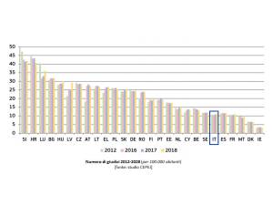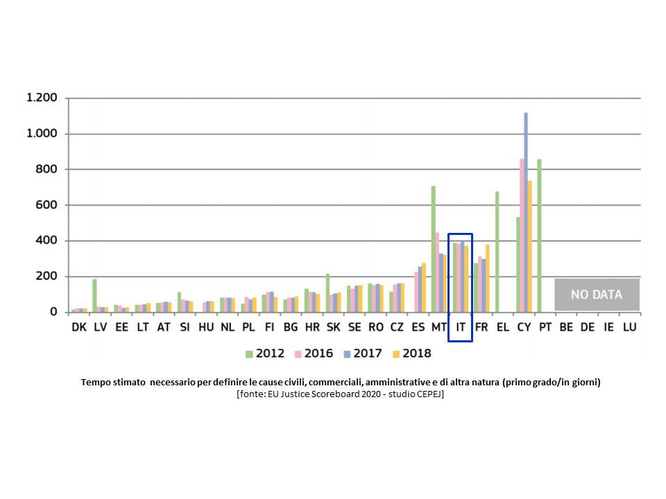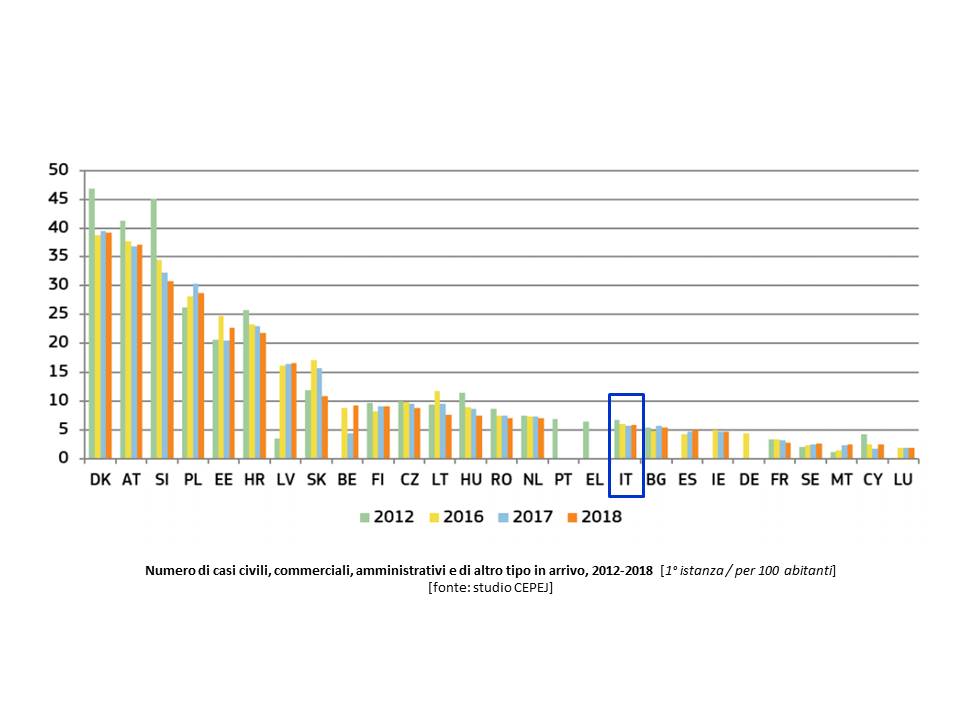 L’Italia è al 18° posto nell’Unione per numero di cause in generale: tuttavia, si colloca al 7° posto per le cause civili e commerciali e al penultimo posto per le cause amministrative.