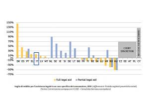 L’Italia ha una forma di gratuito patrocinio che, in via di principio, copre tutte le spese, ma solo per le persone con un reddito che supera di poco più del 10% la soglia di povertà.