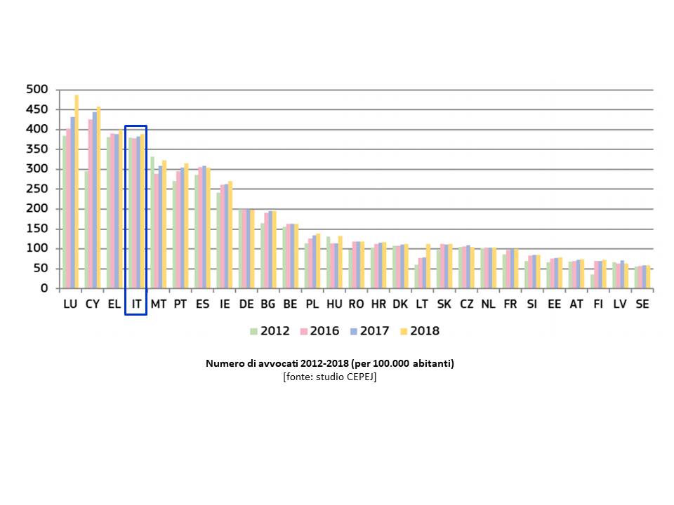 Sul fronte delle risorse umane, quindi, in Italia non è il numero dei magistrati ad essere basso. Il vero problema italiano – come da tempo osservano autorevoli esperti – è che, soprattutto in campo civile e commerciale, ci sono troppi processi, alimentati anche dall’abnorme numero di avvocati che operano in Italia: secondo le statistiche del Conseil des barreaux européens (CCBE) nel 2018 in Italia risultano 237.000 avvocati, rispetto ai 65.480 della Francia e ai 164.000 della Germania.