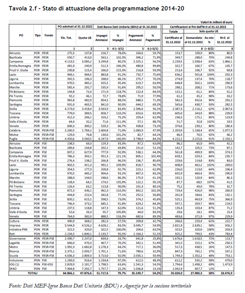 Nella premessa alla “Relazione sullo stato di attuazione della politica di coesione europea e nazionale – Programmazione 2014-2020”, allegata al Documento di Economia e Finanza 2023, si legge: