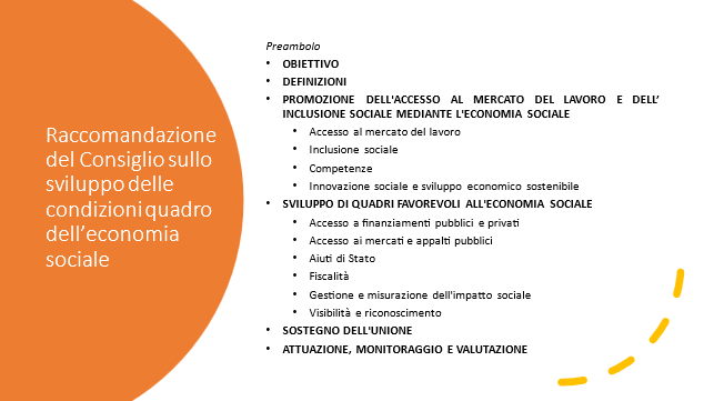 La Raccomandazione del Consiglio dell’Unione europea sullo sviluppo delle condizioni quadro dell’economia sociale ha, quindi, ad oggetto misure volte a promuovere il ruolo dell’economia sociale nell’integrazione delle persone nel mercato del lavoro e nell’inclusione sociale, nonché misure intese a garantire un contesto favorevole per favorirne l’accesso ai finanziamenti, ai mercati degli appalti pubblici, agli aiuti di Stato e alla fiscalità. Contempla, infine, misure volte a migliorare la visibilità e il riconoscimento del settore.